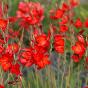 Schizostylis coccinea je južno afriška trajnica, ki v višino zraste 30-50 cm. Od avguasta do oktobra cveti z rdečimi, gladioli podobnimi cvetovi. Najbolje uspeva na sončnih legah v zmerno vlažnih tleh.